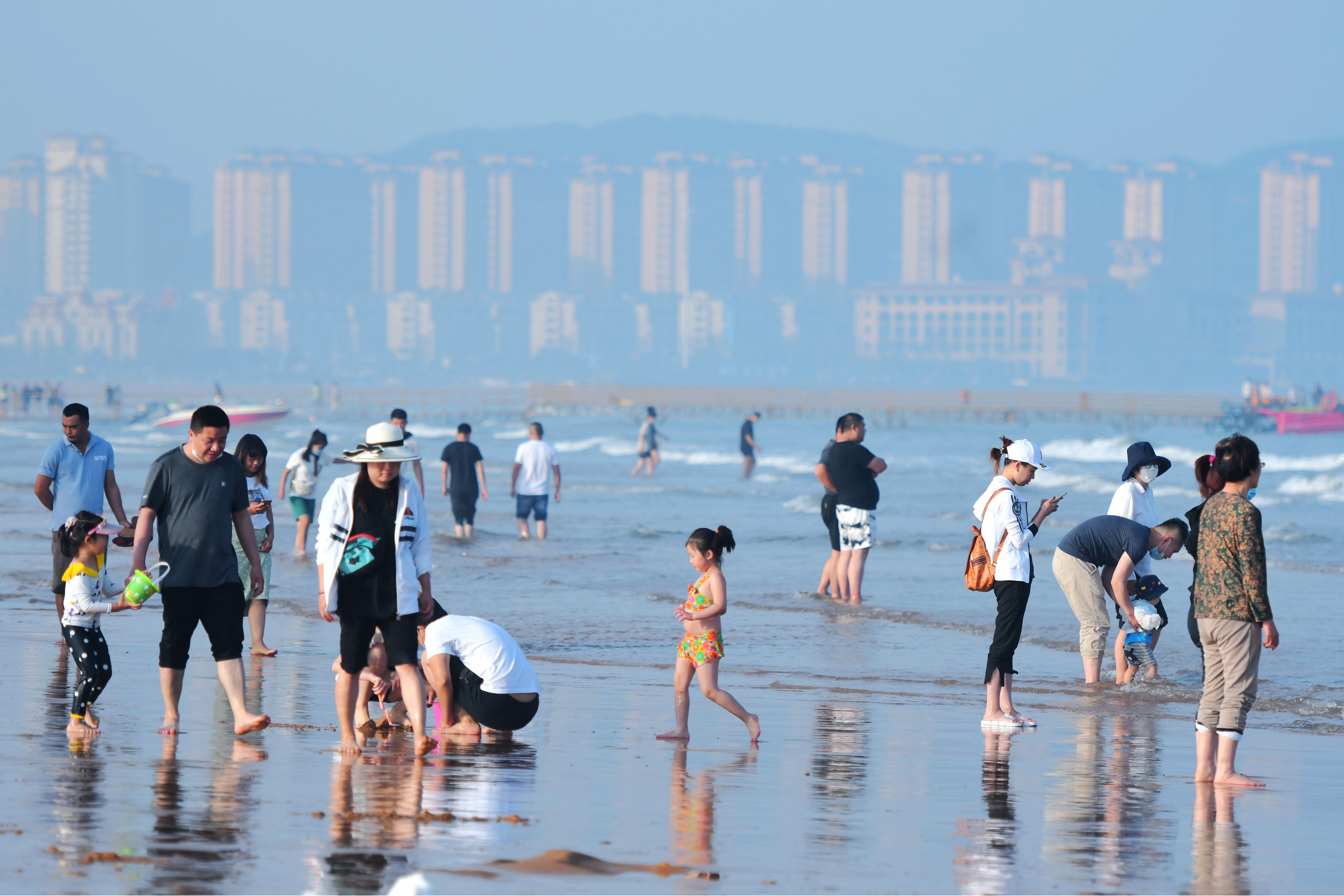 2020年6月3日,山東青島西海岸新區(qū)金沙灘海水浴場(chǎng),游客在海水和沙灘間游玩。