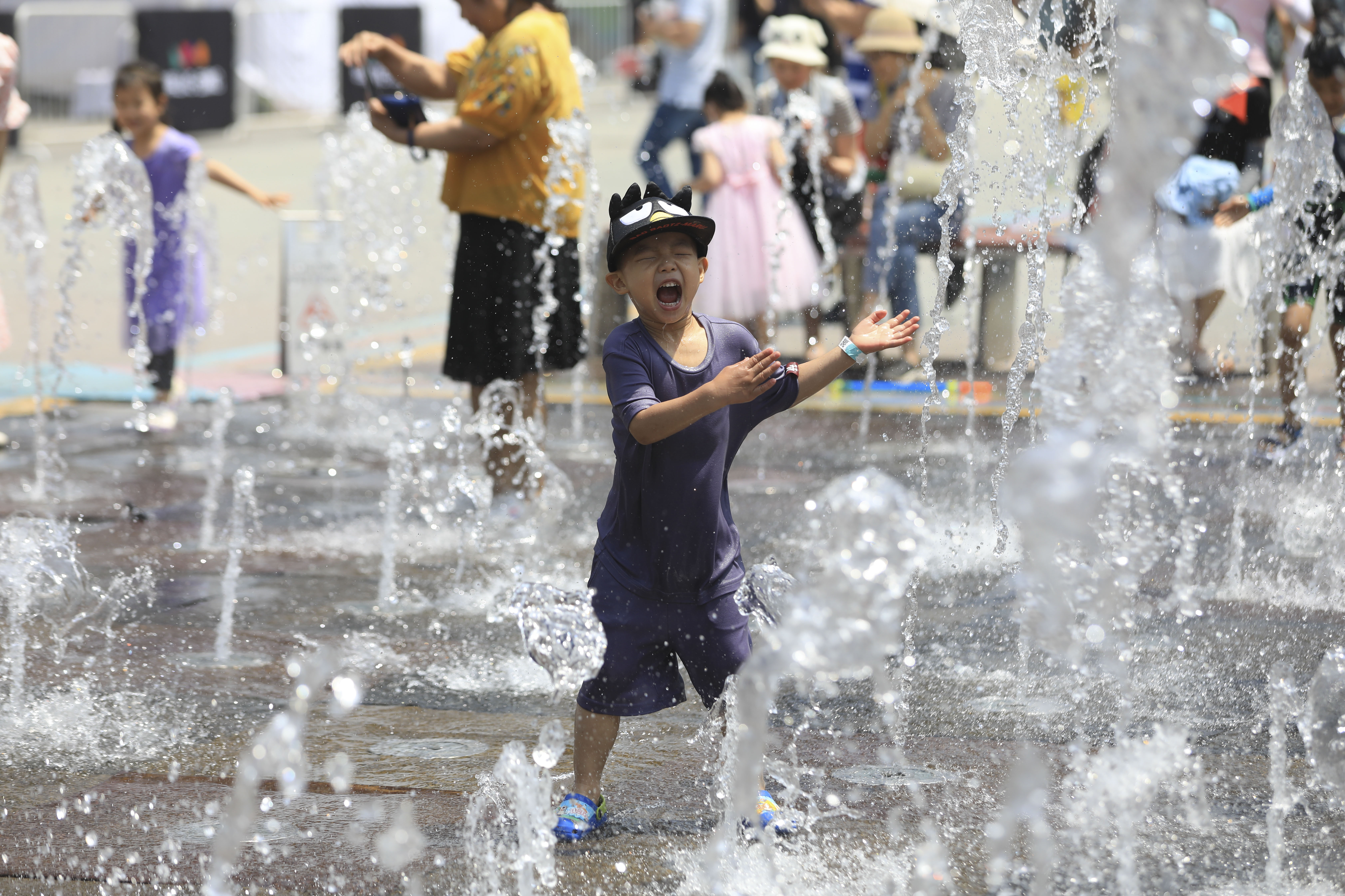 2020年6月7日,北京,華西熙LIVE的噴泉水池成為孩童的戲水降暑天堂。北京6日下午發(fā)高溫藍(lán)色預(yù)警,預(yù)計(jì)6月7日至8日,北京大部分地區(qū)日最高氣溫達(dá)36℃以上。