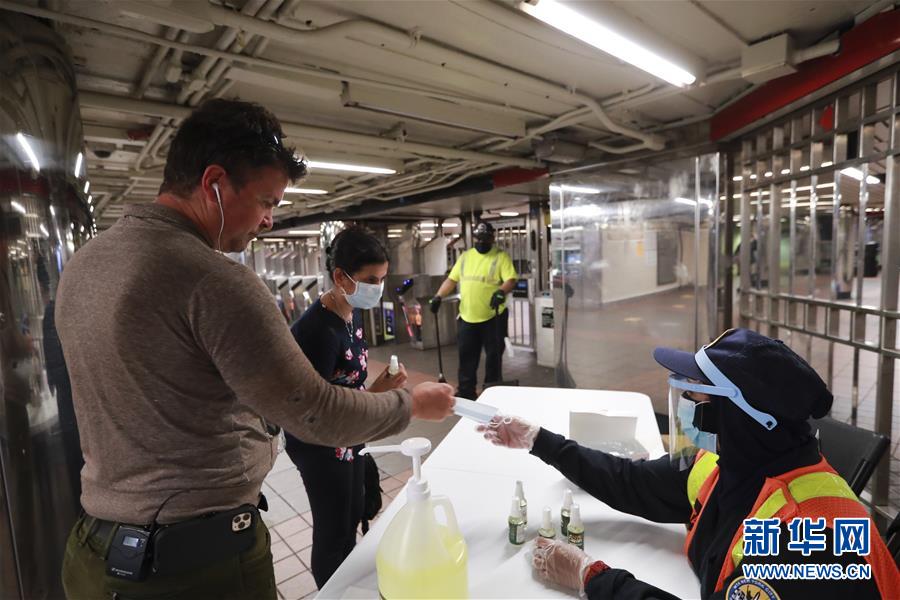 6月8日,在美國紐約,地鐵工作人員為乘客發(fā)放洗手液和口罩。在因新冠疫情進入“居家令”近三個月之后,美國紐約市于當(dāng)?shù)貢r間8日開始“解封”,進入經(jīng)濟重啟的第一階段。新華社記者王迎攝