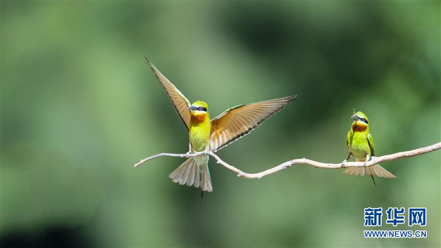 栗喉蜂虎在福建省晉江市深滬鎮(zhèn)科任村一山坡上覓食嬉戲(6月12日攝)。入夏以來,逾百只栗喉蜂虎飛臨閩南晉江市深滬鎮(zhèn)科任村筑巢棲息。新華社記者記者梅永存攝。
