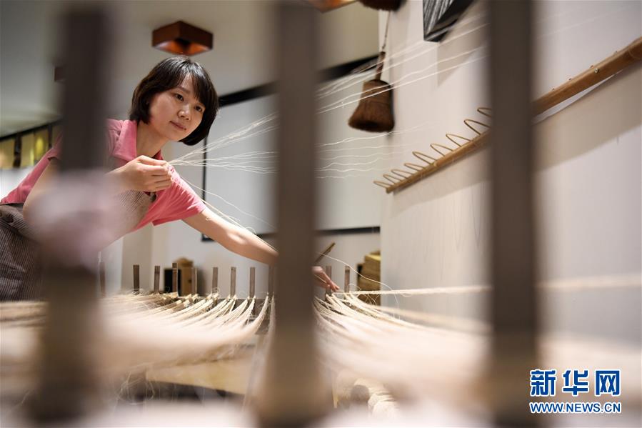 6月12日,在重慶榮昌的天運(yùn)夏布會(huì)館,非遺傳承人馬琳沁在展示傳統(tǒng)夏布生產(chǎn)工藝——牽線。新華社記者 唐奕 攝