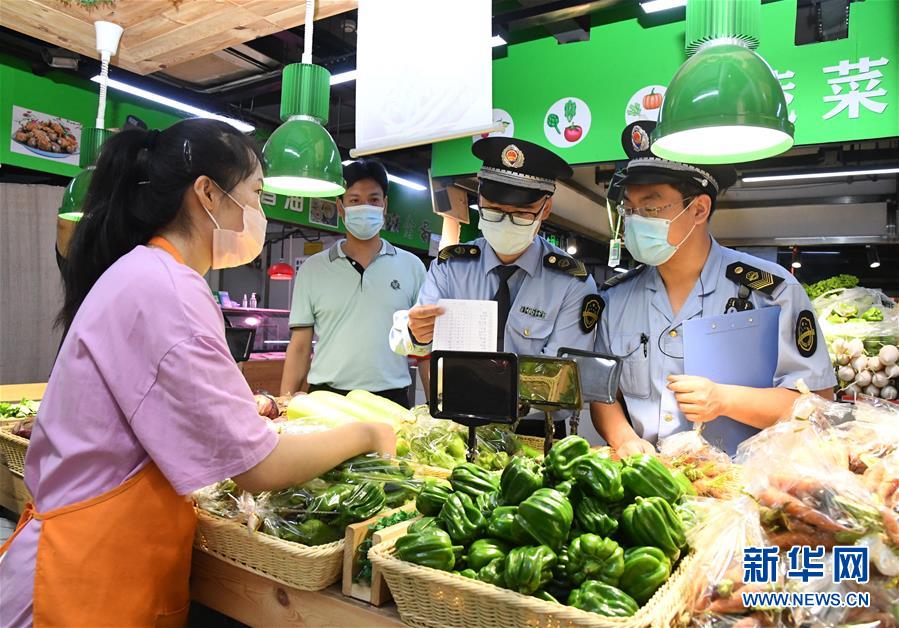 6月17日,在位于北京市海淀區(qū)的增光鴻運(yùn)市場,執(zhí)法人員對商戶所售蔬菜的進(jìn)貨渠道進(jìn)行檢查。新華社記者 任超 攝