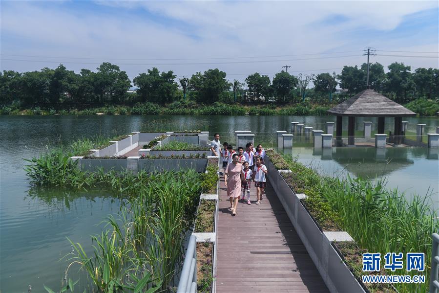 6月17日,洛舍鎮(zhèn)中心學(xué)校的師生們參觀水情館的室外園區(qū)。新華社記者 徐昱 攝