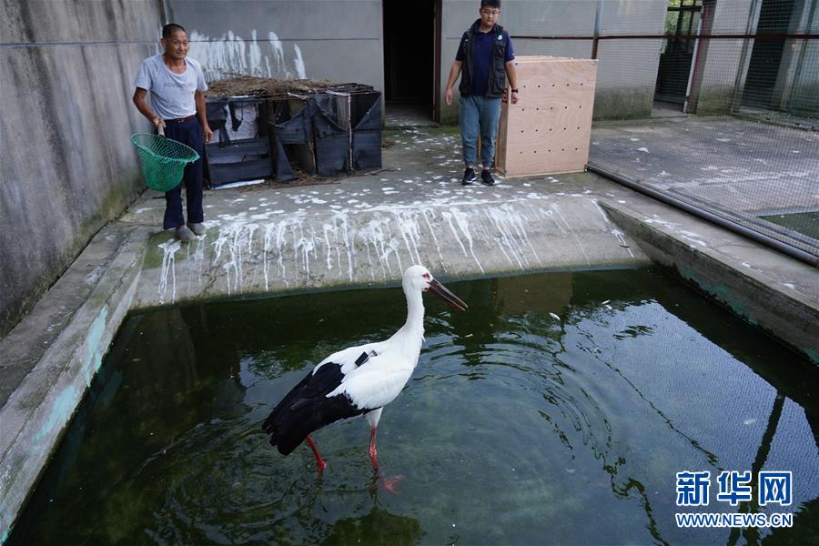 6月17日,工作人員準備將三只東方白鸛裝箱。新華社記者 周密 攝