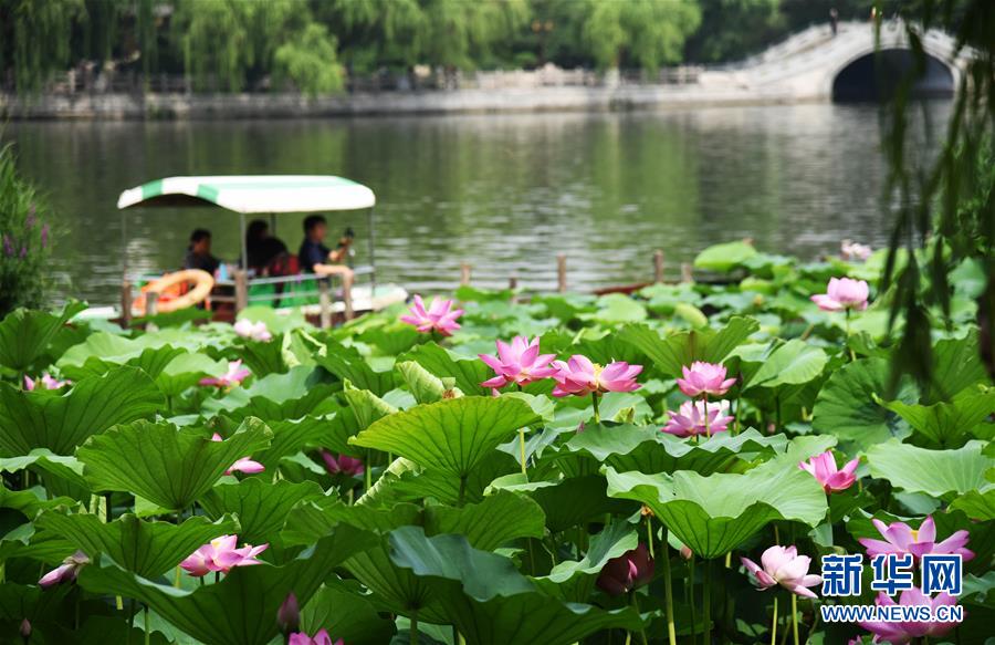 6月19日,市民泛舟在大明湖上。近日,山東濟(jì)南大明湖的荷花陸續(xù)綻放,吸引游客前來(lái)觀賞。新華社記者 王凱 攝