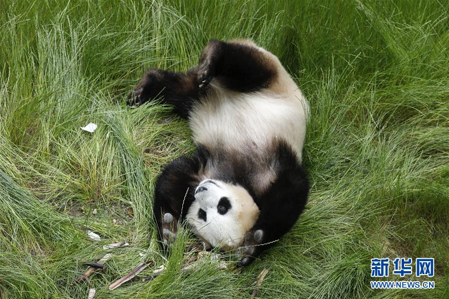 在位于四川省阿壩藏族羌族自治州的九寨溝大熊貓園,大熊貓“海海”在打滾(6月19日攝)。新華社記者沈伯韓攝