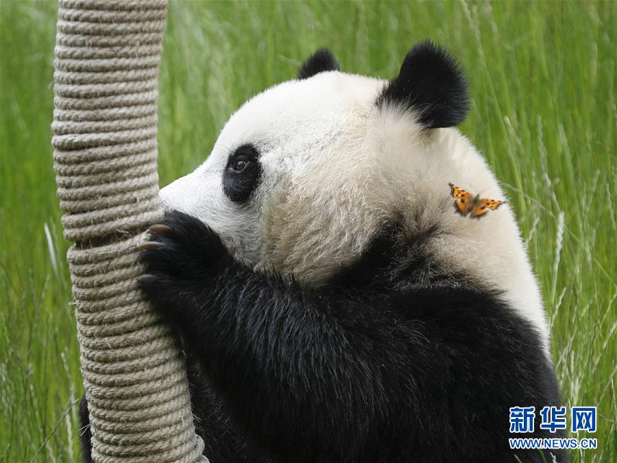 在位于四川省阿壩藏族羌族自治州的九寨溝大熊貓園,大熊貓“新新”在玩耍(6月19日攝)。新華社記者沈伯韓攝