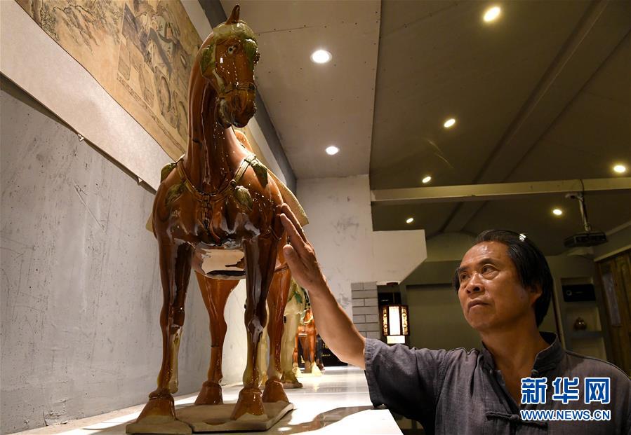 游光明在河南省鞏義市站街鎮(zhèn)小黃冶村的傳習(xí)所里查看作品(6月19日攝)。新華社記者李安攝