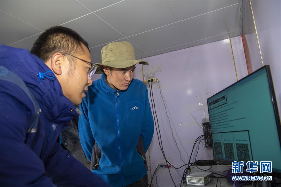 在中國科學(xué)院新疆天文臺(tái)慕士塔格觀測站,馮國杰(左)為助理觀測員阿克力·圖拉提講解當(dāng)晚觀測要點(diǎn)(6月15日攝)。新華社記者胡虎虎攝