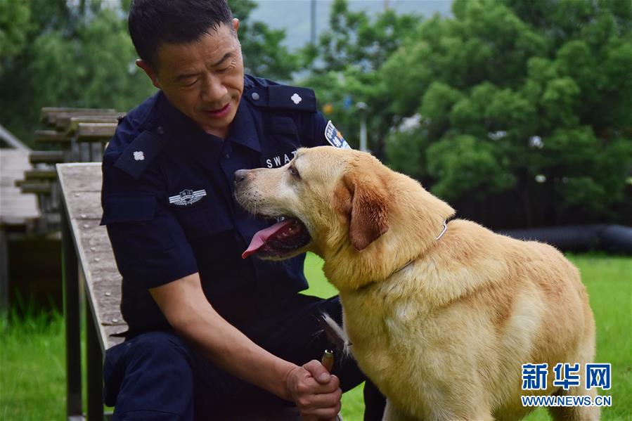 6月24日,緝毒犬“多多”完成訓練后,與訓導員周吉榮親密互動。 新華社記者 鄭夢雨 攝