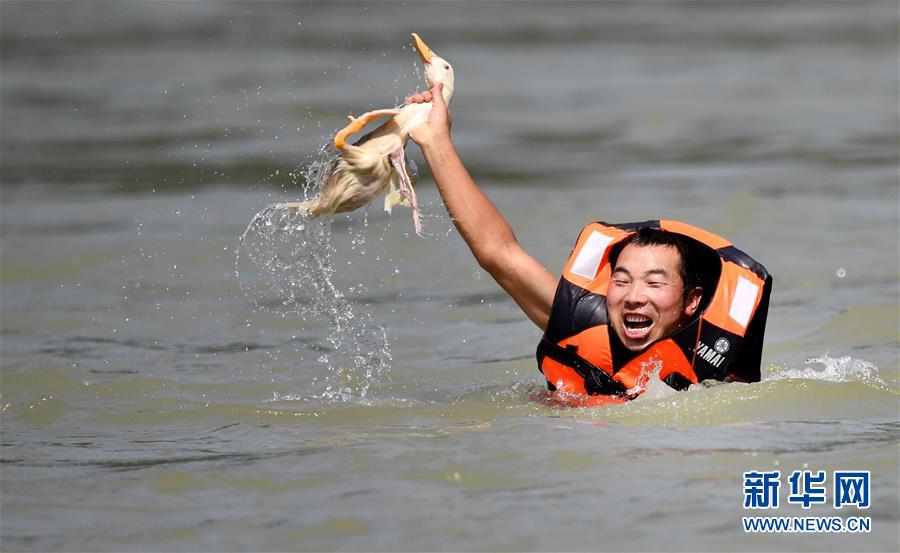 6月25日,參賽選手將放歸漢江中的鴨子抓到手中,鉆出水面,舉過頭頂,引來岸上一片歡呼。龍舟賽最引人注目的是搶鴨子、抓鯉魚。新華社記者 陶明 攝