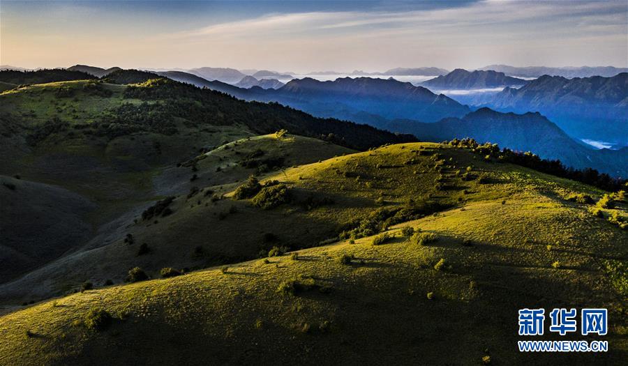6月30日,朝霞照耀下的神田草甸(無人機(jī)照片)。位于陜西省安康市嵐皋縣與重慶市城口縣交界處大巴山神田主脊北坡的神田草甸,面積超過1.1萬畝。夏日的朝霞中,起伏的草甸仿佛一塊寬大無邊的綠色地毯,鑲嵌在大巴山上,如詩如畫。新華社記者陶明攝
