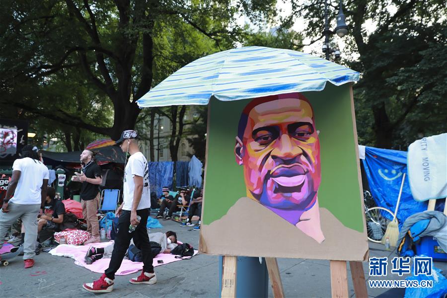 這是6月30日在美國(guó)紐約市政廳外“占領(lǐng)市政廳”抗議活動(dòng)現(xiàn)場(chǎng)拍攝的弗洛伊德畫(huà)像。由美國(guó)明尼蘇達(dá)州明尼阿波利斯市非裔男子弗洛伊德遭白人警察暴力執(zhí)法而死一事引發(fā)的各種抗議活動(dòng)仍在紐約持續(xù)進(jìn)行。新華社記者王迎攝