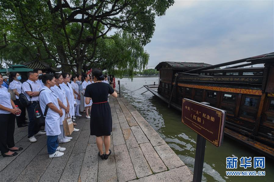 7月1日,嘉興市新冠肺炎疫情抗疫一線黨員在南湖景區(qū)的中共一大紀(jì)念船邊參加“七一”活動(dòng)。新華社記者徐昱攝