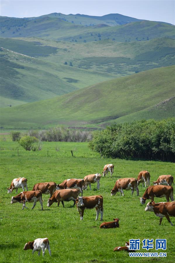 烏蘭毛都草原上的牛群(7月2日攝)。盛夏時節(jié),內蒙古興安盟科爾沁右翼前旗的烏蘭毛都草原綠意盎然,風景醉人。烏蘭毛都草原地處大興安嶺南麓,屬丘陵山地草原,風光獨特。新華社記者貝赫攝