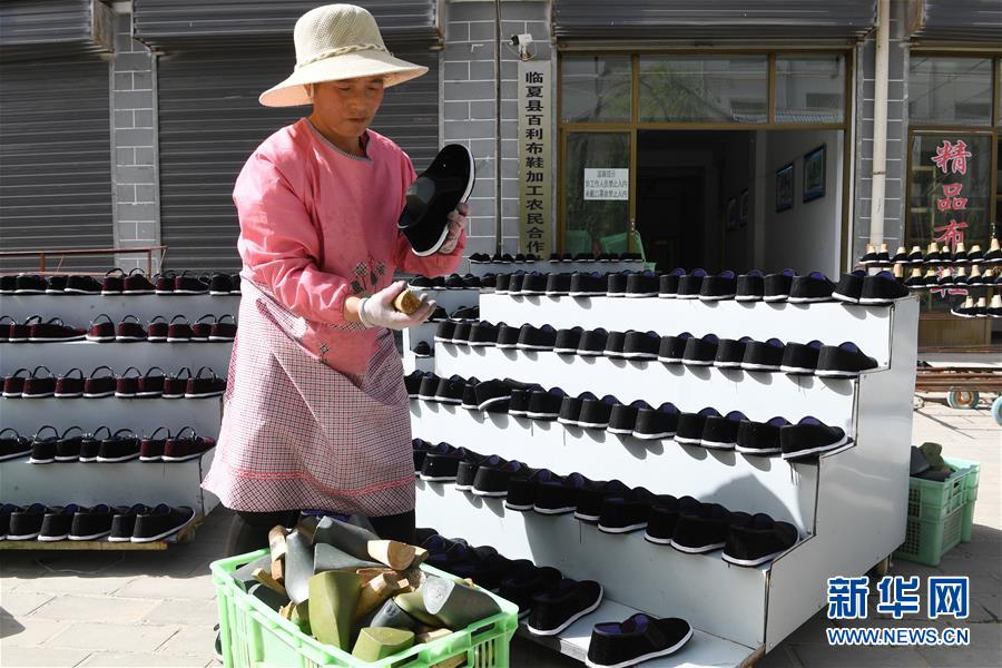 7月2日,臨夏縣百利布鞋加工農(nóng)民專業(yè)合作社員工在擺放布鞋。甘肅省臨夏回族自治州臨夏縣將布鞋加工定為重點(diǎn)扶持發(fā)展的產(chǎn)業(yè),采用“政府+公司+貧困戶”的產(chǎn)業(yè)扶貧模式,由政府主導(dǎo)、企業(yè)出資,在貧困村建設(shè)“扶貧車(chē)間”,吸納貧困群眾從事布鞋加工產(chǎn)業(yè)增加收入。截至2019年底,當(dāng)?shù)夭夹庸て髽I(yè)和加工戶遍及近百個(gè)行政村,從業(yè)人員達(dá)到4000多人,累計(jì)生產(chǎn)布鞋600多萬(wàn)雙,實(shí)現(xiàn)銷售收入2.32億元。新華社記者范培珅攝