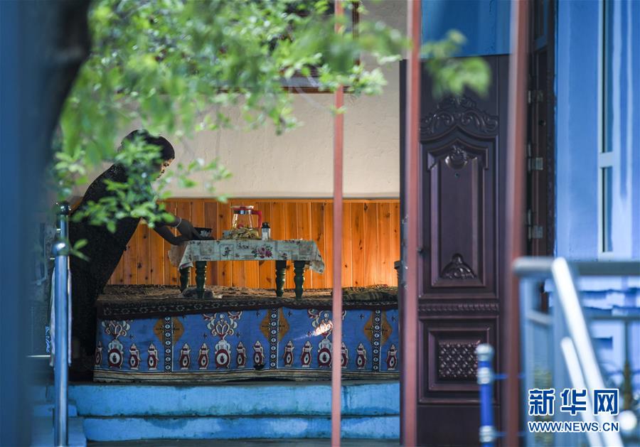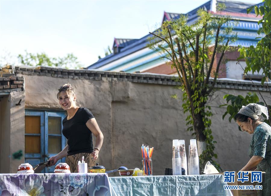 7月4日,在位于六星街內(nèi)的一家民居前,房主麥爾比巖·艾買提江(左)和母親在售賣自家制作的酸奶。新華社記者王菲攝