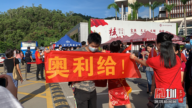 考生學(xué)長(zhǎng)來(lái)到深圳紅嶺中學(xué)考點(diǎn)門口為學(xué)弟舉起“奧利給”的旗子。