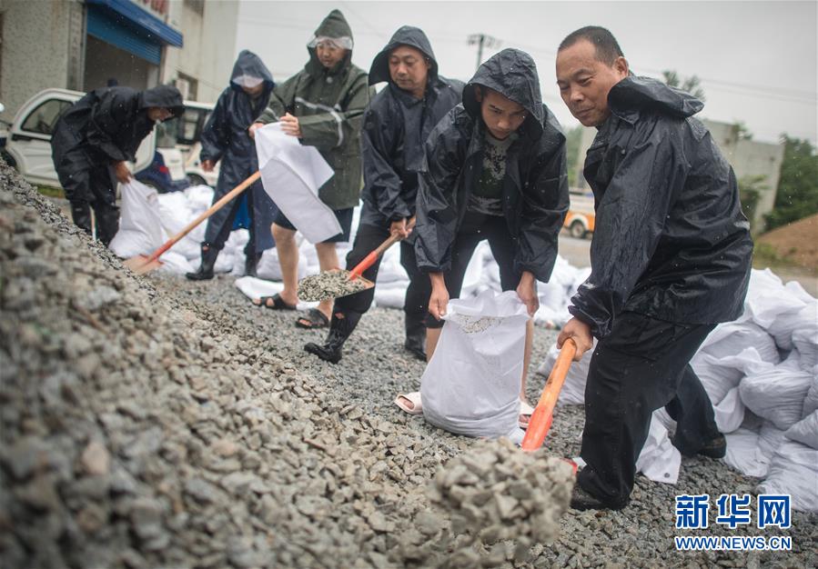 7月7日,武漢市洪山區(qū)天興鄉(xiāng)工作人員在裝填防洪石料。新華社記者肖藝九攝