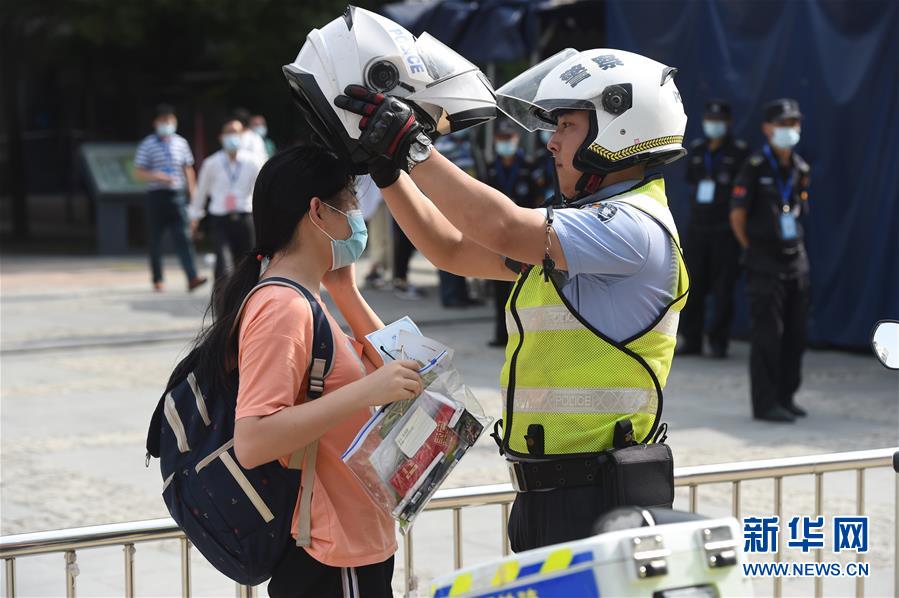 7月7日,在安徽省合肥市五十中學(xué)天鵝湖校區(qū)考點(diǎn),交警將快要遲到的考生送到考場(chǎng)。當(dāng)日,2020年高考拉開帷幕。新華社記者周牧攝