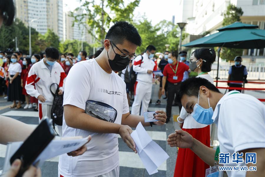 7月7日,在位于北京的中國人民大學(xué)附屬中學(xué)考點(diǎn)外,工作人員查驗(yàn)考生準(zhǔn)考證和身份證等證件信息。當(dāng)日,2020年高考拉開帷幕。新華社記者沈伯韓攝