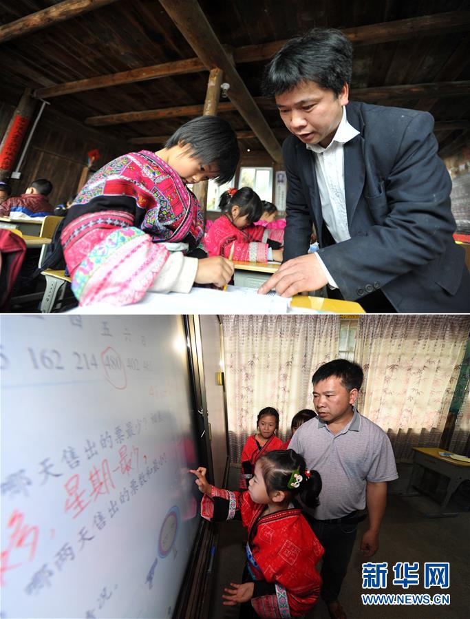 這是一張拼版照片,上圖:在廣西龍勝龍脊鎮(zhèn)江柳村翁江小學,余啟貴老師輔導學生做課堂作業(yè)(2013年2月26日攝);下圖:在廣西龍勝龍脊鎮(zhèn)江柳村翁江小學,余啟貴老師輔導學生做課堂作業(yè)(7月7日攝)。新華社記者陸波岸攝