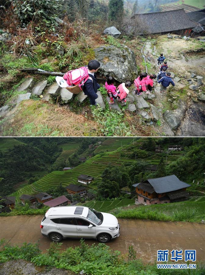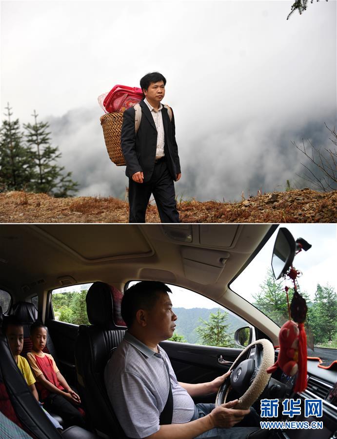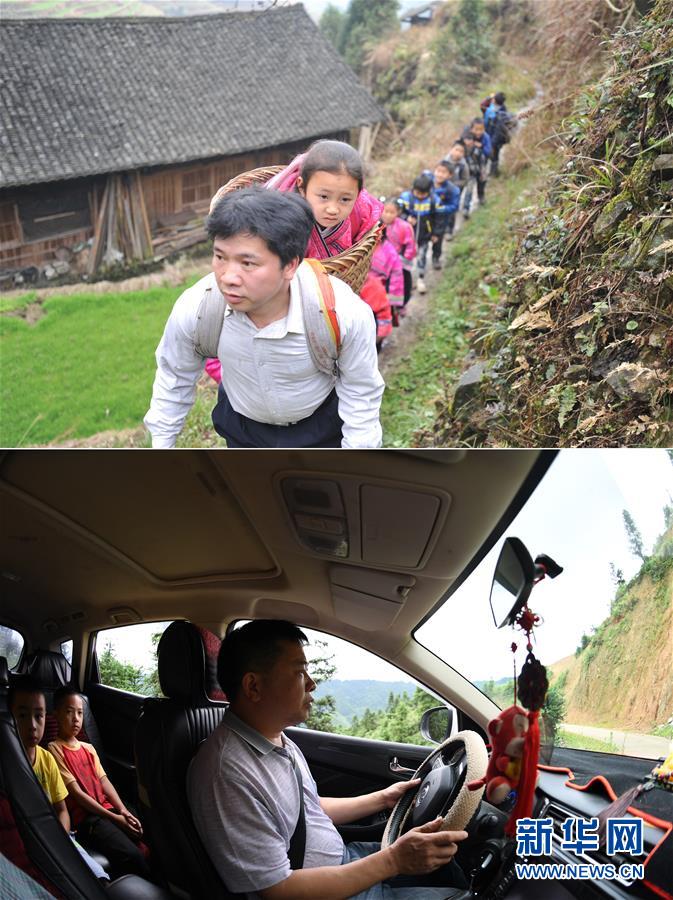這是一張拼版照片,上圖:在廣西龍勝龍脊鎮(zhèn)江柳村,余啟貴老師背著背簍領著學生去學校(2013年2月26日攝);下圖:在廣西龍勝龍脊鎮(zhèn)江柳村,余啟貴老師開著自己的汽車帶著學生去學校(7月7日攝)。新華社記者陸波岸攝