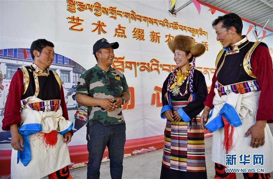 山南市扎囊縣桑耶鎮(zhèn)乃卡村第一書記、駐村工作隊隊長次仁羅布(左二)和村文藝演出隊演員交流(7月7日攝)。新華社記者張汝鋒攝