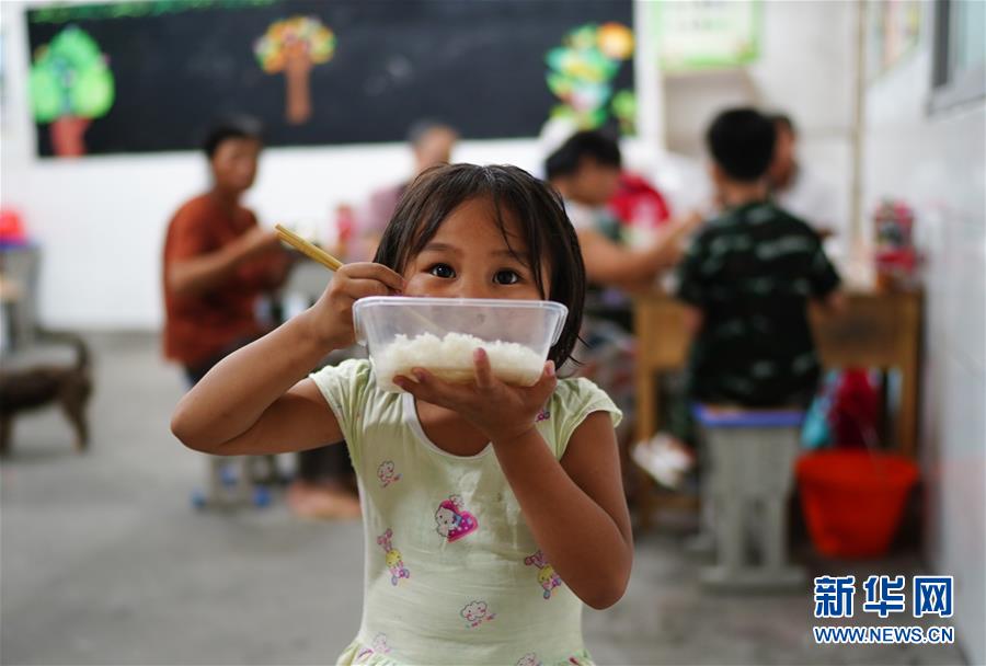 7月9日,小朋友在安置點里吃飯。當(dāng)日,江西鄱陽縣鄱陽鎮(zhèn)因洪水受災(zāi)的村民被轉(zhuǎn)移到多個集中安置點。在鄱陽縣五一中心學(xué)校安置點,志愿者和工作人員接到任務(wù)后不到十小時內(nèi),為被轉(zhuǎn)移村民布置了28間教室,供519人安頓,并為村民發(fā)放褥子、床單、枕頭、盒飯、飲用水等物資。新華社記者周密攝