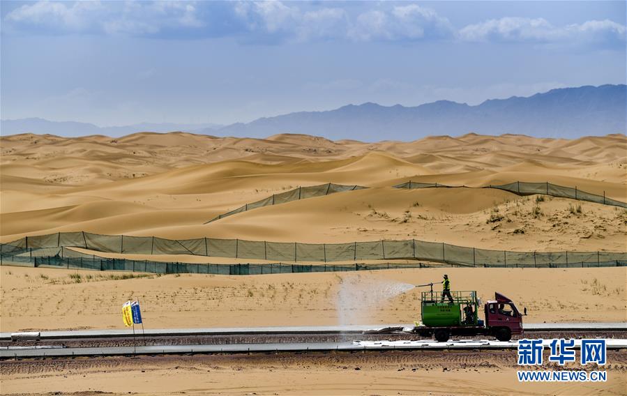 7月10日,工人在位于寧夏境內的烏瑪高速青銅峽至中衛(wèi)段A9標段施工。盛夏時節(jié),位于寧夏境內的烏瑪(內蒙古烏海市至青?,斍呖h)高速青銅峽至中衛(wèi)段正在抓緊施工建設。該路段主線全長122.9公里,其中穿越騰格里沙漠腹地的18公里公路是寧夏建設的首條沙漠高速公路,預計2021年建成通車。新華社記者馮開華攝。