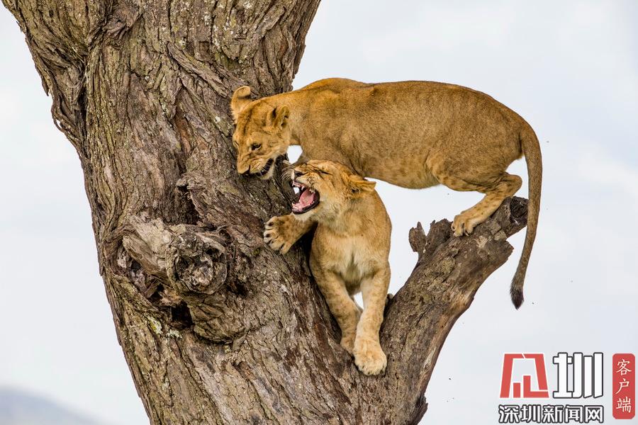 2020年7月13日?qǐng)?bào)道(具體拍攝時(shí)間不詳),Sandesh Kadur是一名印度野生動(dòng)物攝影師,他在坦桑尼亞塞倫蓋蒂國家公園拍攝到一系列“獅子上樹”的精彩照片。畫面中,有一只憤怒的母獅為了捍衛(wèi)自己在樹上的位置,一邊劈叉一邊對(duì)著鏡頭咆哮,有兩只獅子為了爭奪位置互相攻擊,還有一只獅子在找到舒適的位置后呼呼大睡。