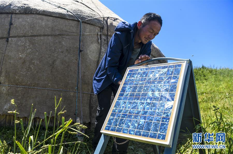 在新疆伊犁特克斯縣境內的夏牧場里,一位牧民在氈房外調整太陽能板的擺放位置(7月2日攝)。新華社記者 王菲 攝