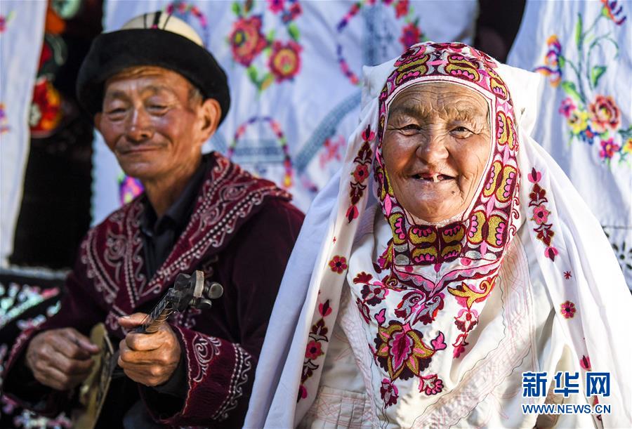 在新疆伊犁特克斯縣境內的夏牧場里,兩位老人在氈房內彈奏冬不拉唱歌(7月2日攝)。新華社記者 王菲 攝