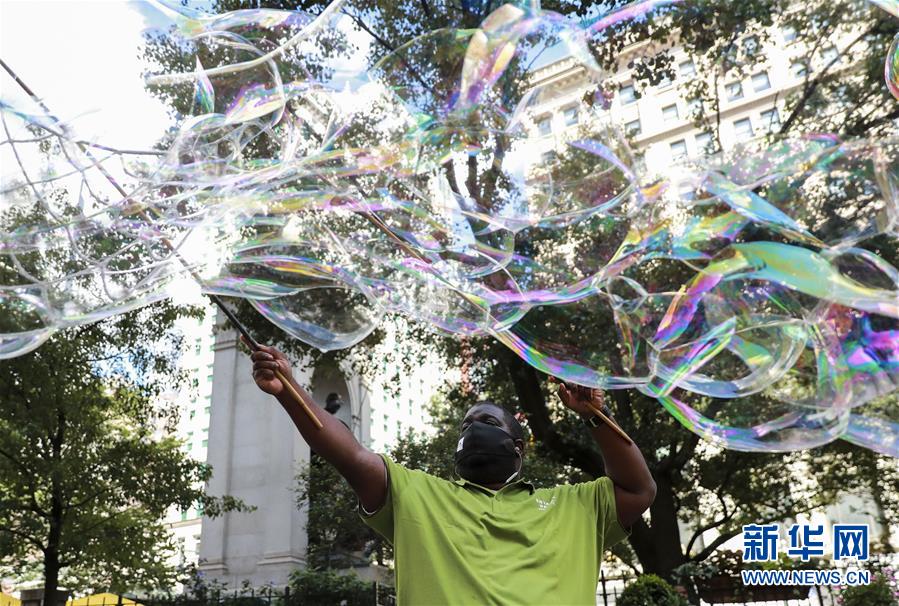 7月14日,美國紐約街頭一名戴口罩的男子表演“泡泡秀”。美國約翰斯·霍普金斯大學(xué):截至北京時間15日6時34分,全球新冠確診病例達(dá)13258016例,死亡病例為576752例。美國是全球疫情最嚴(yán)重的國家,確診病例達(dá)3416222例,死亡病例為136319例。新華社記者 王迎 攝