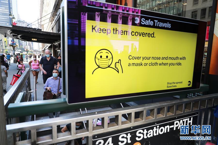 7月14日,人們佩戴口罩進(jìn)入美國紐約地鐵站。美國約翰斯·霍普金斯大學(xué):截至北京時間15日6時34分,全球新冠確診病例達(dá)13258016例,死亡病例為576752例。美國是全球疫情最嚴(yán)重的國家,確診病例達(dá)3416222例,死亡病例為136319例。新華社記者 王迎 攝