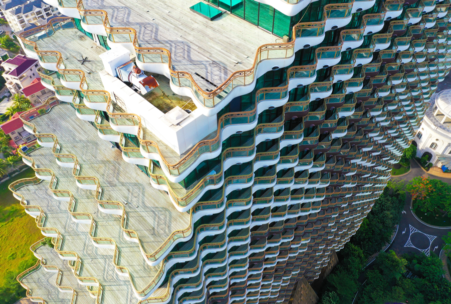 2020年7月20日,海南省三亞市,圖為航拍的“九棵大樹”建筑群。建筑物陽臺(tái)均為波浪形,視野良好,契合三亞“?!钡膶傩?。