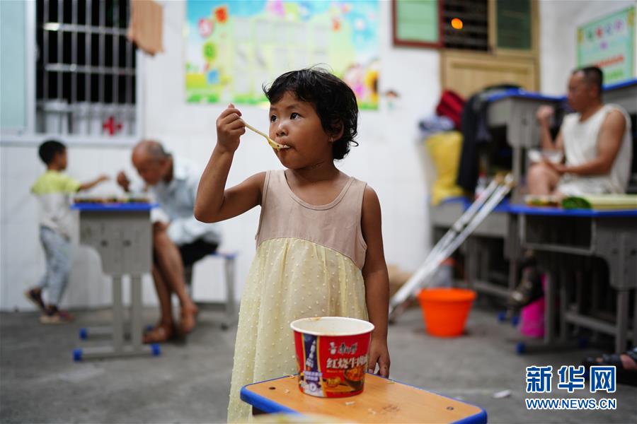 小朋友在江西鄱陽縣五一中心學(xué)校安置點(diǎn)吃飯(7月9日攝)。新華社記者周密攝