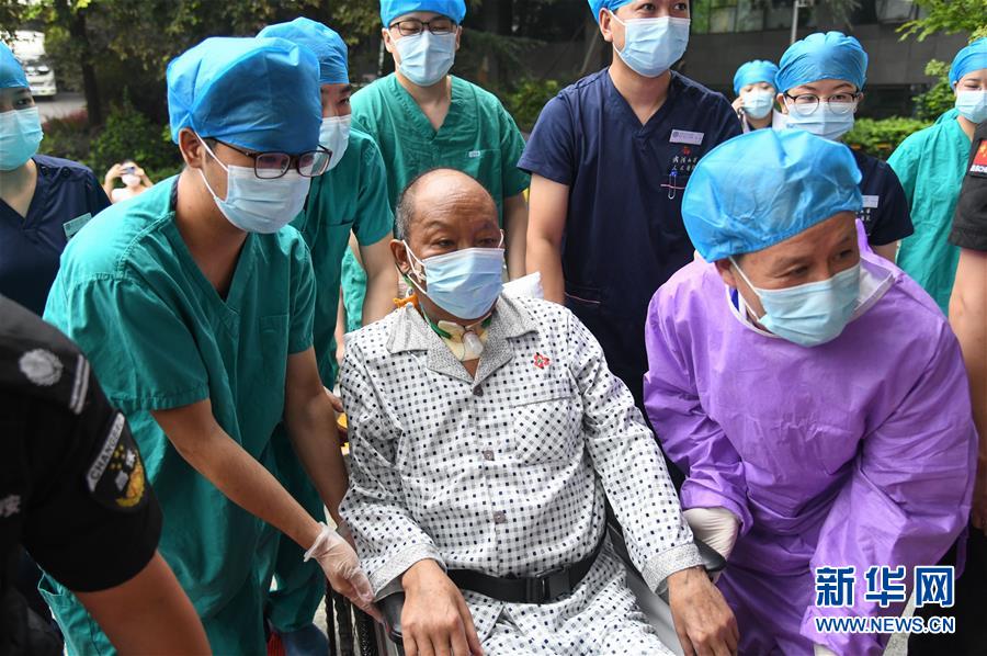 7月21日,武漢大學人民醫(yī)院醫(yī)護人員護送崔先生出院。新華社記者程敏攝