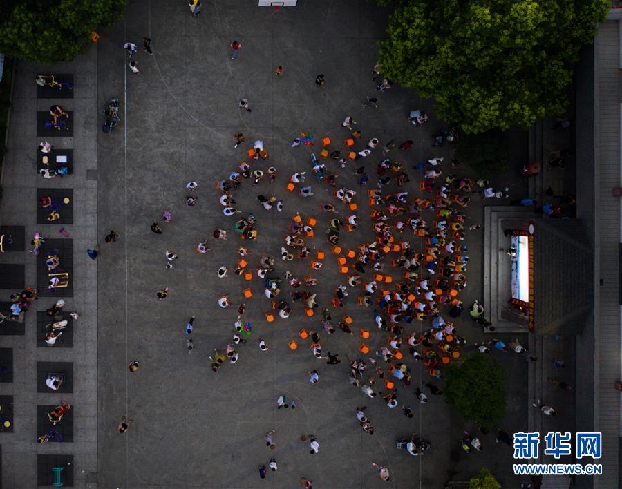 7月21日,“衛(wèi)家班皮影戲”劇團(tuán)的藝人們?cè)诤湍罉虼宓奈幕Y堂前為村民們上演傳統(tǒng)皮影戲,豐富鄉(xiāng)村百姓夏季文化生活(無人機(jī)照片)。新華社記者徐昱攝