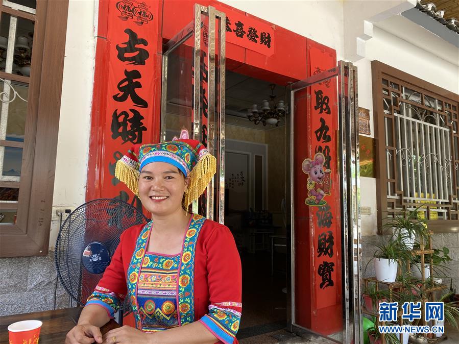 廣西恭城瑤族自治縣蓮花鎮(zhèn)紅巖村村民楊燕紅穿著民族服飾坐在家門(mén)口等待客人到來(lái)(7月16日攝)。新華社記者林凡詩(shī)攝