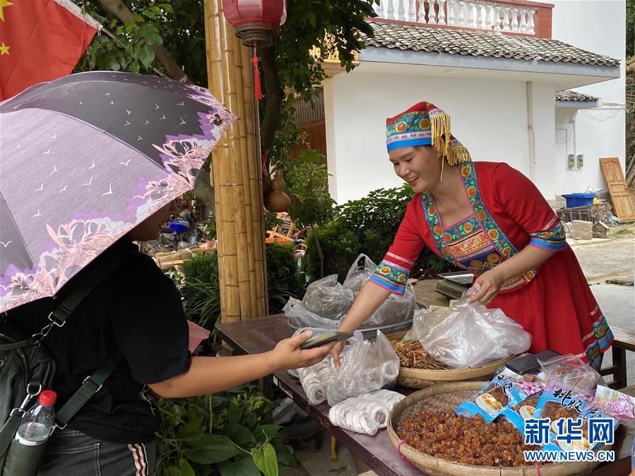 廣西恭城瑤族自治縣蓮花鎮(zhèn)紅巖村村民楊燕紅在家門(mén)口向客人推銷本地特產(chǎn)(7月16日攝)。新華社記者林凡詩(shī)攝