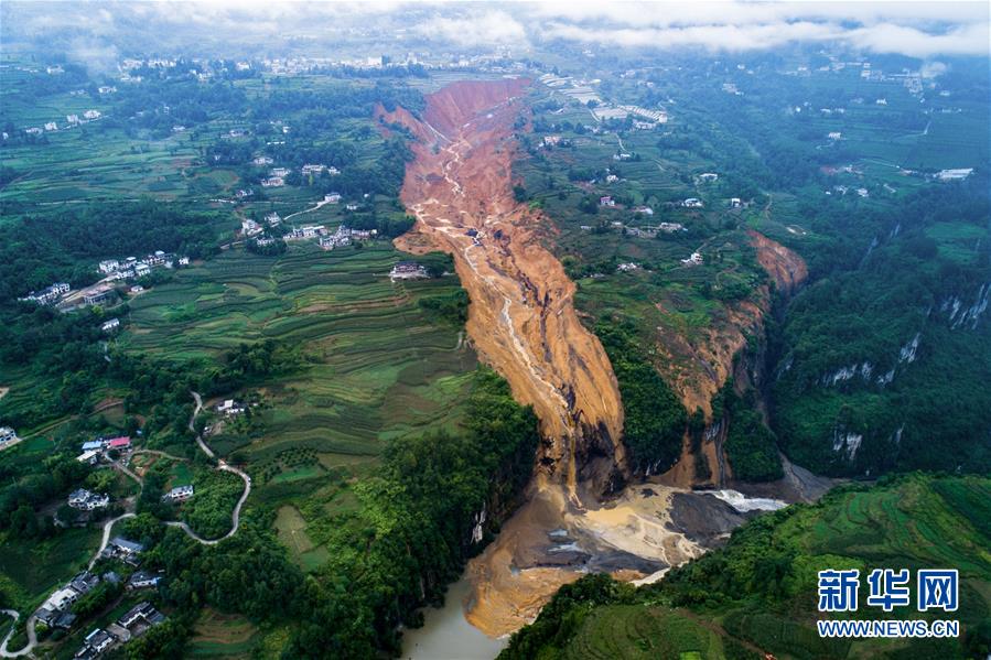 7月22日拍攝的因恩施州屯堡鄉(xiāng)馬者村山體滑坡形成的堰塞湖(無(wú)人機(jī)照片)。新華社記者肖藝九攝