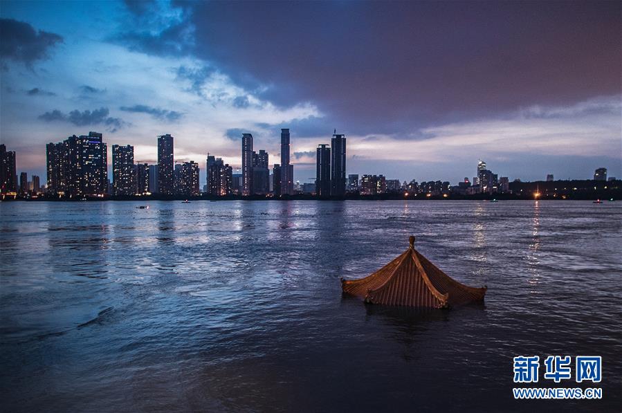 上漲的江水即將淹沒(méi)武昌黃花磯涼亭(7月13日攝)。新華社記者 肖藝九 攝