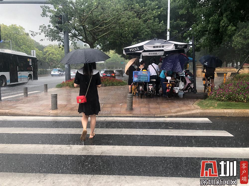 雨勢較大,市民紛紛躲在交警執(zhí)勤使用的雨傘下避雨。
