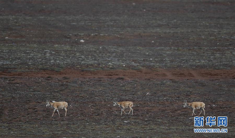 這是7月7日在可可西里卓乃湖區(qū)域拍攝的三只藏羚羊。新華社記者張龍攝