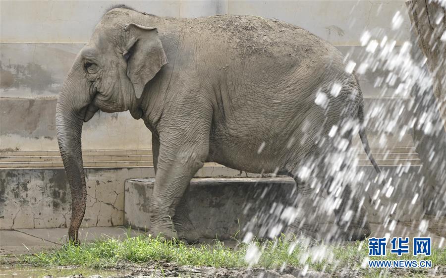 北京動物園的大象在降溫噴淋設施旁(7月30日攝)。炎炎夏日,北京動物園根據動物生活習性,為動物配備了自動噴淋噴霧、空調籠舍、恒溫水池、遮陽棚等各類避暑設施,同時還準備了西瓜等降溫食品,保障動物平安舒適地度過伏天。新華社記者李欣攝
