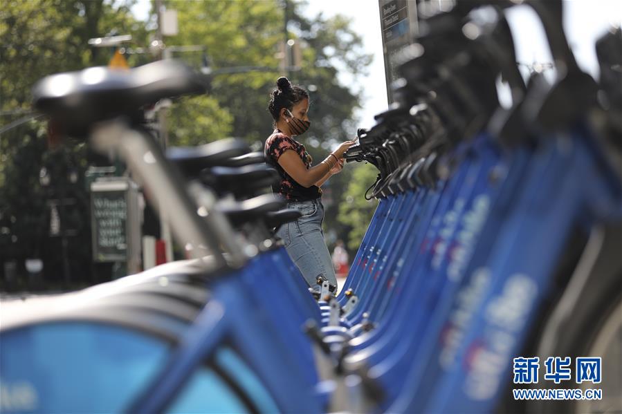 7月29日,在美國紐約,一名女子準備取用共享單車。美國約翰斯·霍普金斯大學實時統(tǒng)計數(shù)據(jù)顯示,截至29日,美國累計新冠確診病例已超過440萬例,累計死亡病例超過15萬例。新華社記者王迎攝