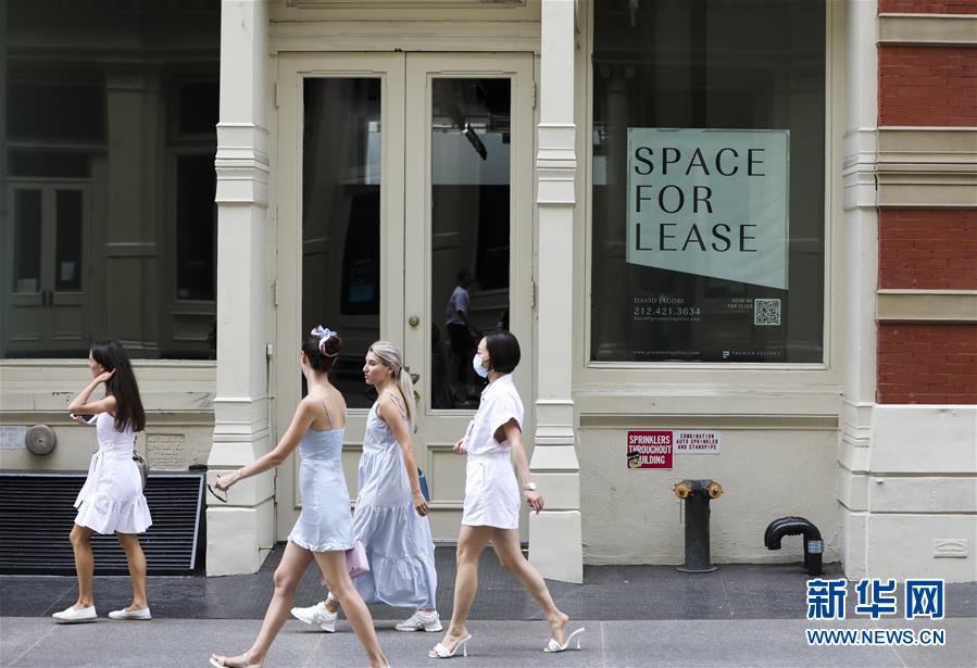 7月30日,在美國紐約蘇豪商業(yè)區(qū),人們從一家招租的店面旁走過。美國商務部30日公布的首次預估數(shù)據(jù)顯示,受新冠疫情導致經(jīng)濟大面積“停擺”和消費停滯拖累,今年第二季度美國實際國內生產(chǎn)總值(GDP)按年率計算下滑32.9%,創(chuàng)1947年有記錄以來最大降幅。新華社記者王迎攝