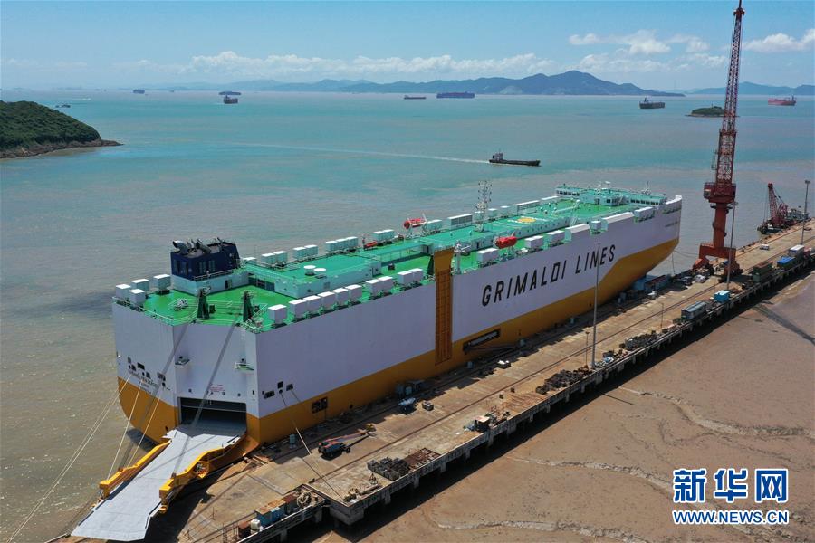 8月1日在位于螞蟻島的揚帆集團東海岸造船廠拍攝的一艘在建的汽車滾裝船,月底即將交付給意大利客戶(無人機照片)。新華社記者黃宗治攝