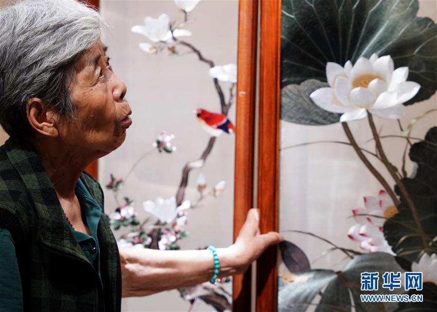 在開(kāi)封市素花宋繡工藝有限公司的展示館里,王素花在觀看自己的刺繡作品(7月30日攝)。新華社記者李嘉南攝
